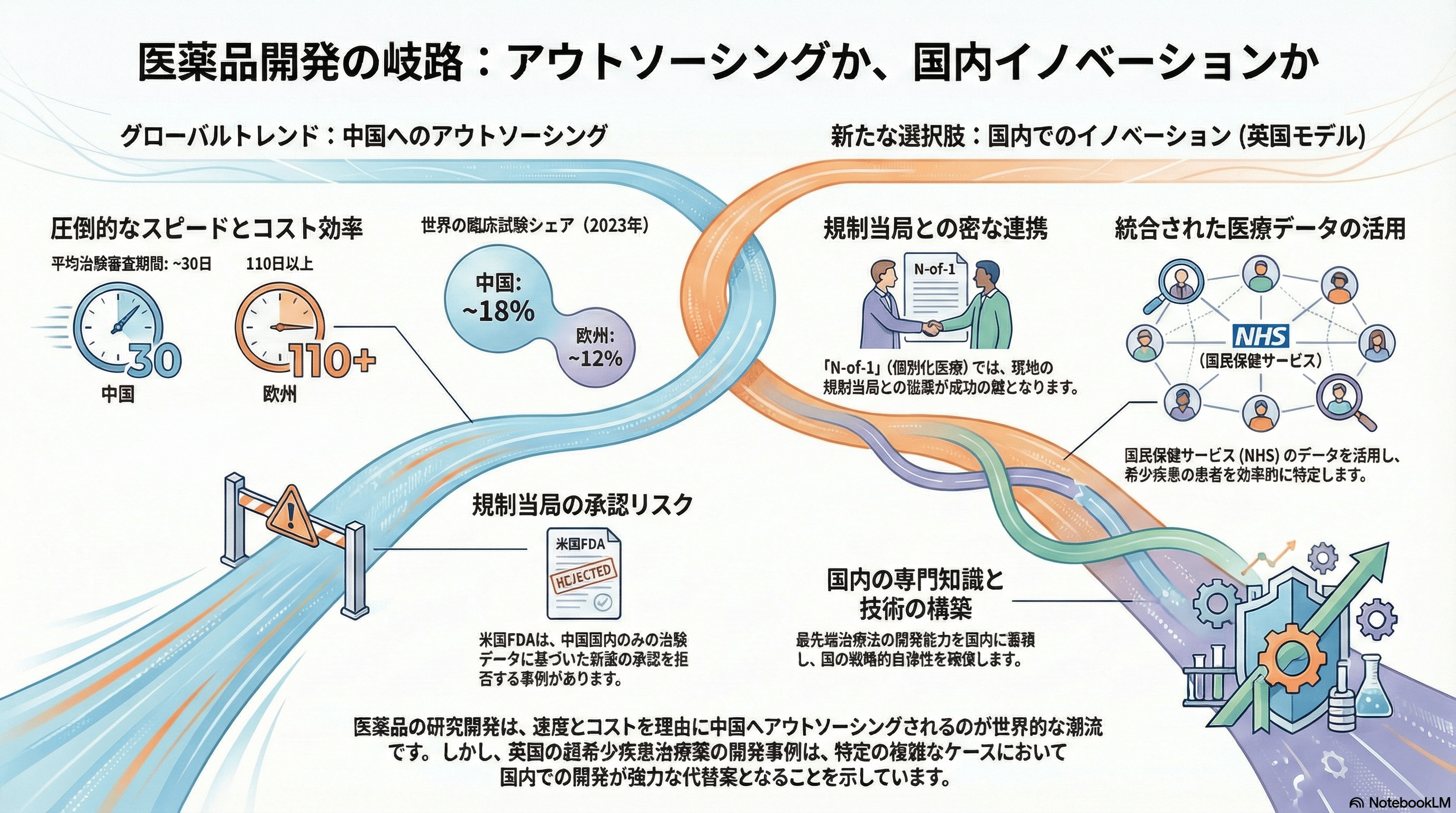 中国は人材・資金・迅速な規制運用を背景に、創薬・臨床のアウトソーシング先として存在感を拡大(商業スポンサー臨床試験シェアは2023年に中国約18%、欧州は約12%へ低下、EUの審査は平均110日超で米国/中国は約30日)。
