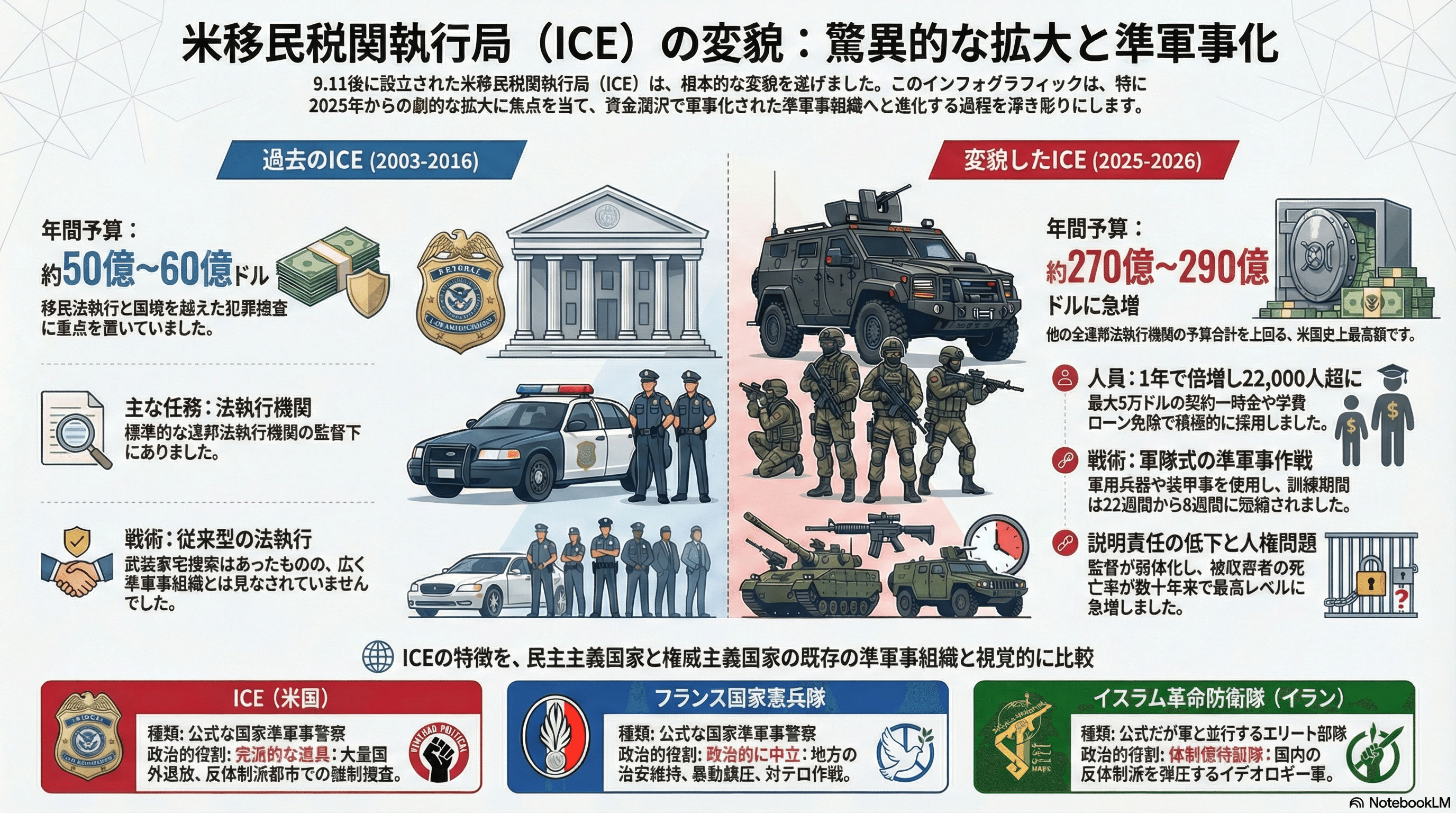 ICEは2003年創設後、特に2025〜2026年に予算・人員・装備・戦術が急拡大して準軍事化が進み、監督や説明責任の弱体化と党派化が懸念されると論じる。