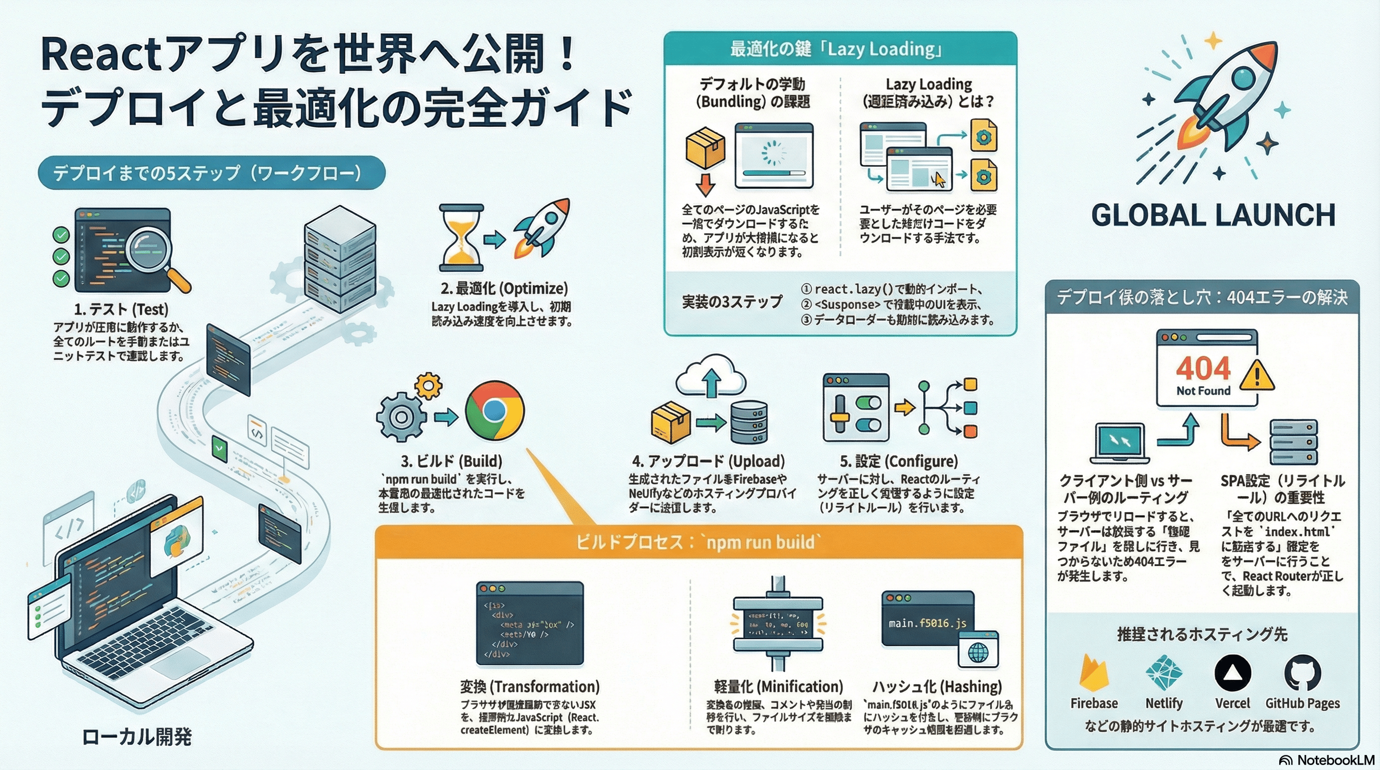 npm run buildによる本番ビルドの仕組み(変換・圧縮・トランスパイル・ハッシュ化)と、静的サイトホスティングの概念を紹介