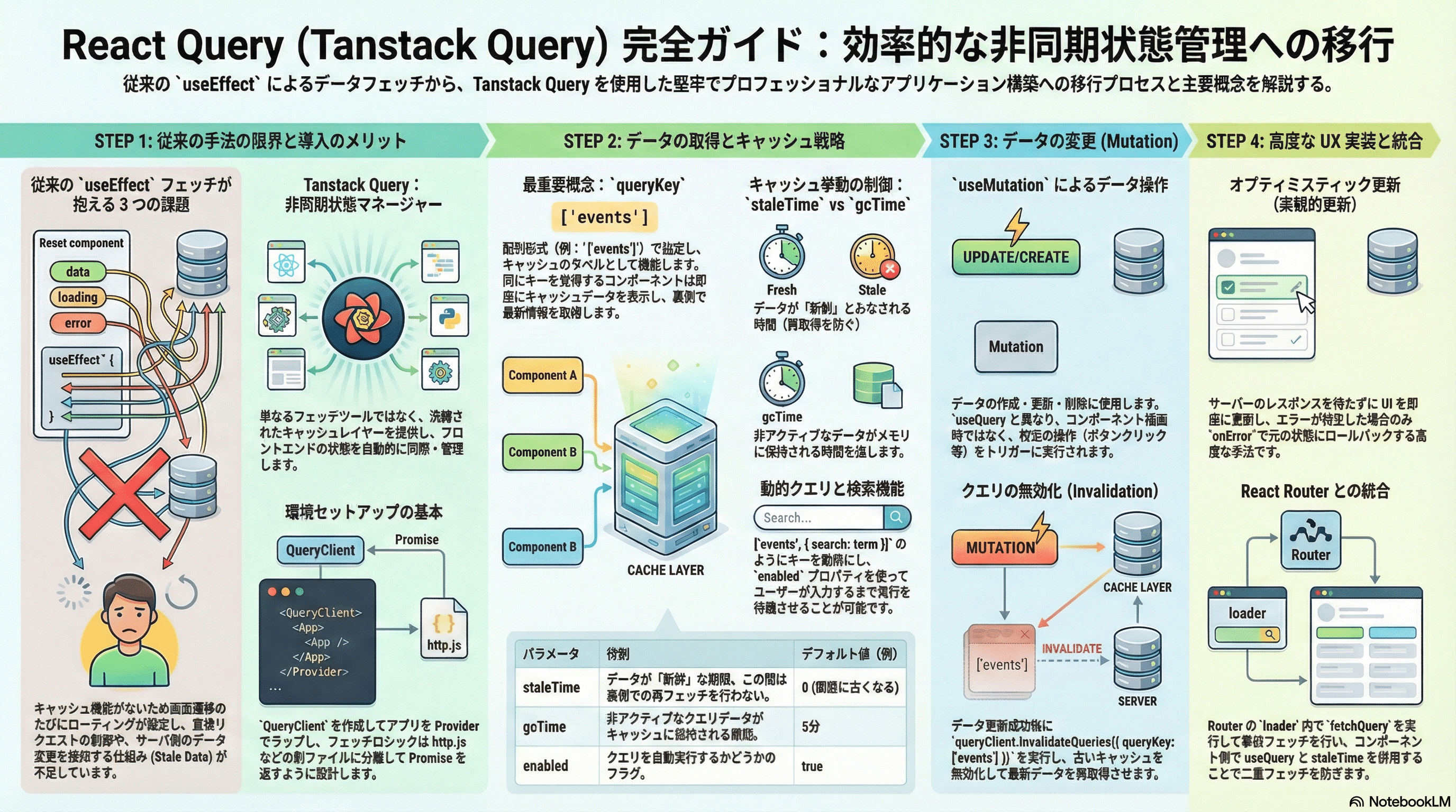 :productIdのような動的ルートパラメータ、useParams/useNavigateフック、絶対パスと相対パスの違い、インデックスルートといった応用的なルーティング機能をカバー